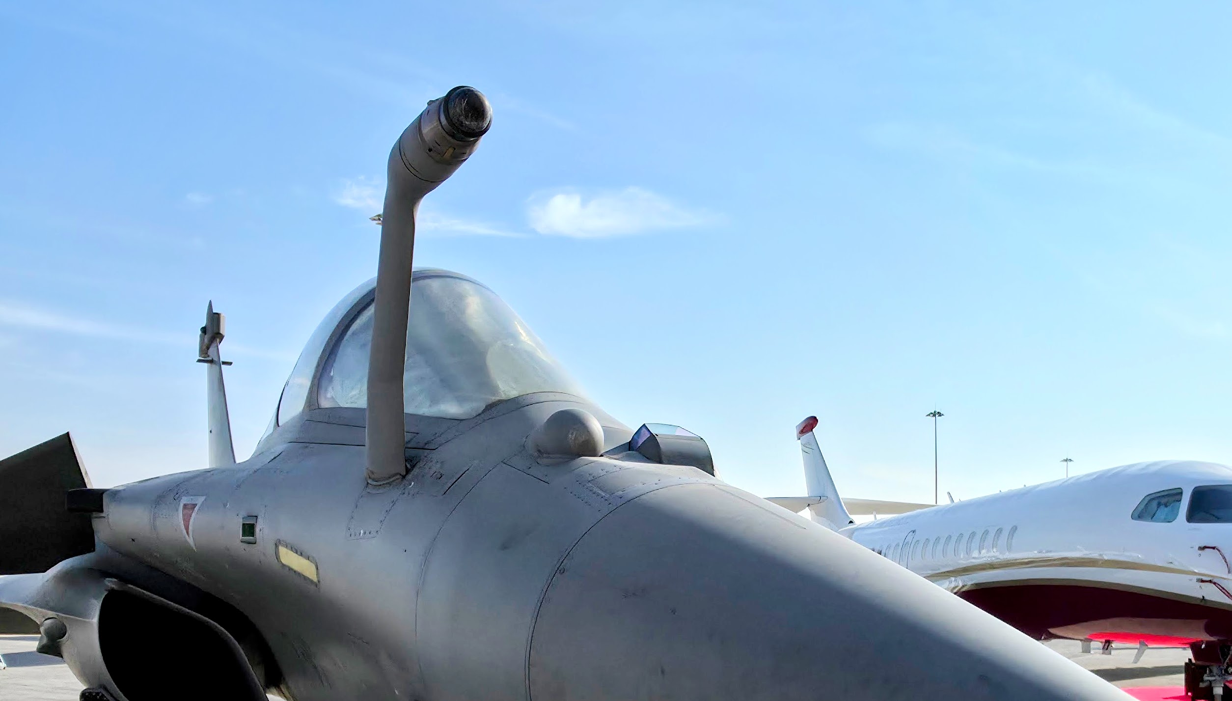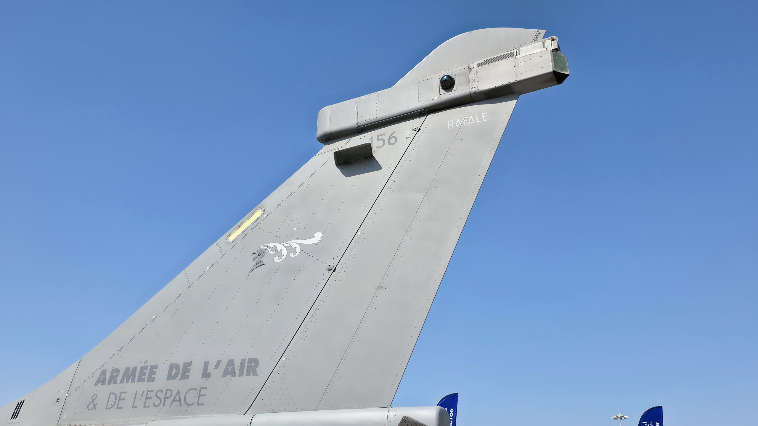 Do sada ni jedan HRZ Rafal nije uočen sa MBDA segmentom „SPECTRA“ sistema – DDM-NG senzorom (vidljiv ovde na letelici francuskog RV, podseća izgledom na CCTV kameru) koji služi za detekciju IC raketa koje napadaju avion. Francuski avion „156“ fotografisan u novembru u Dubaiju izvorno je F.3R modernizovan na F4.1 standard / Foto: Petar Vojinović, Tango Six